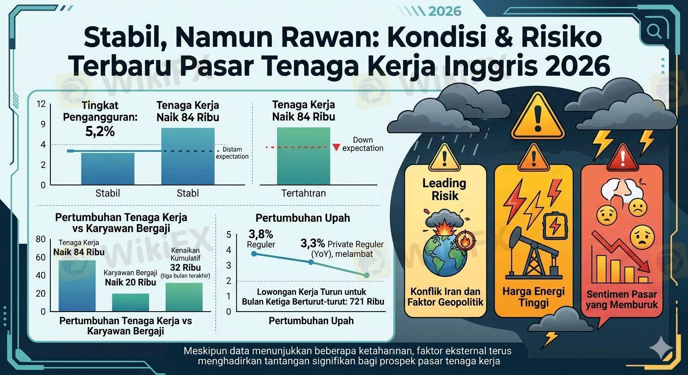 Pasar tenaga kerja Inggris menunjukkan tanda-tanda stabilisasi di awal 2026, dengan tingkat pengangguran bertahan di 5,2%—lebih baik dari perkiraan pasar—dan jumlah tenaga kerja serta karyawan bergaji meningkat signifikan. Pertumbuhan upah melambat, memberikan ruang bagi Bank of England untuk bernapas di tengah kekhawatiran inflasi yang masih bertahan. Meski demikian, Deutsche Bank memperingatkan bahwa risiko baru seperti konflik Iran, sentimen pasar yang memburuk, dan harga energi tinggi dapat dengan cepat membalikkan tren pemulihan ini. Di tengah momentum positif, prospek ke depan tetap dibayangi ketidakpastian geopolitik dan ekonomi yang cukup besar.