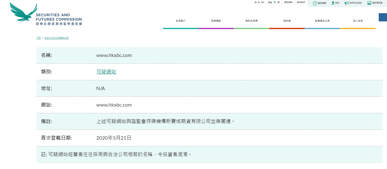 Nama: www.hkxbc.com Kategori: Alamat Situs Web Mencurigakan: n/a Situs web: www.hkxbc.com Keterangan: Situs web mencurigakan di atas terkait dengan lembaga berlisensi SFC 新寶城期貨有限公司 Tidak terhubung. Tanggal publikasi pertama: 21 Mei 2020 Catatan: Operator situs web yang mencurigakan sering menggunakan nama yang mirip dengan perusahaan yang sah, membingungkan investor. " Daftar Perusahaan Tanpa Izin dan Situs Web Mencurigakan mencantumkan perusahaan yang tidak memiliki izin di Hong Kong dan telah menarik perhatian SFC. Perusahaan-perusahaan ini diduga atau sedang memasarkan ke investor Hong Kong, atau mengklaim memiliki tautan ke Hong Kong. Anda dapat mencari berdasarkan nama atau kategori untuk melihat apakah perusahaan ada dalam daftar. Daftar ini tidak lengkap. Karena SFC sering menemukan perusahaan atau situs web catatan, yang baru ditambahkan ke daftar dari waktu ke waktu. Jika Anda pernah didekati oleh perusahaan tidak berlisensi, silakan gunakan formulir keluhan online kami. Untuk informasi lebih lanjut tentang ruang ketel uap, situs web penipuan, dan email phishing, silakan klik tautan yang relevan. CATATAN: Daftar perusahaan tidak berlisensi dan situs web mencurigakan dimaksudkan Untuk mengeluarkan peringatan dini kepada investor. Investor tidak dapat hanya mengandalkan informasi dalam daftar di atas, mereka perlu memeriksa detail masing-masing perusahaan dengan cermat. Silakan pilih huruf bahasa Inggris pertama dari nama setiap kolom untuk melihat daftar, atau klik "Nama Cina" kolom menelusuri perusahaan dengan nama China saja."