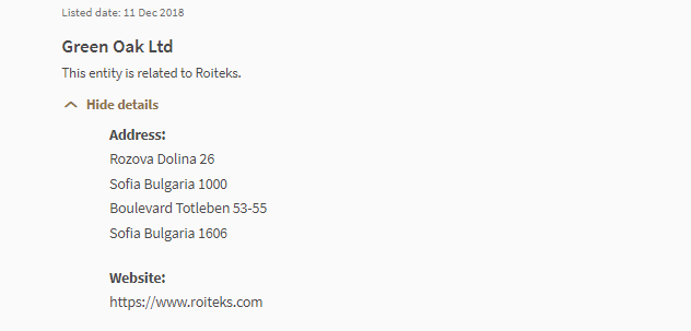 "daftar peringatan investor Daftar peringatan investor memberikan daftar orang-orang yang, berdasarkan informasi yang tersedia untuk mas, i) mungkin atau mungkin telah salah dianggap sebagai orang yang diberi lisensi atau dengan cara lain diberi wewenang atau diatur oleh mas; ii) telah membuat penawaran unit dalam kepercayaan bisnis atau skema investasi kolektif yang mungkin atau mungkin dianggap salah sebagai disahkan, diakui atau didaftarkan oleh mas; iii) telah membuat penawaran investasi yang mungkin atau mungkin salah dianggap sebagai dibuat atau disertai dengan dokumen yang diajukan atau didaftarkan dengan mas.daftar ini tidak lengkap dan didasarkan pada apa yang diketahui mas pada waktu diterbitkan." tanggal terdaftar: 11 des 2018 Green Oak LTD entitas ini terkait dengan ROITEKS . sembunyikan detail alamat: rozova dolina 26 sofia bulgaria 1000 boulevard totleben 53-55 sofia bulgaria 1606 situs web: https://www. ROITEKS .com
