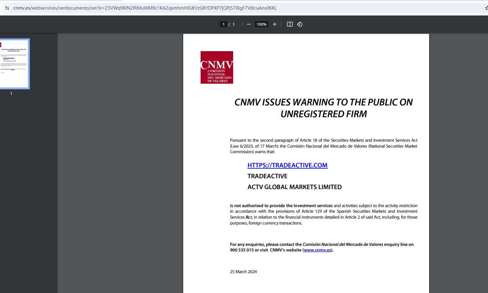 cnmv mengeluarkan peringatan kepada publik tentang perusahaan yang tidak terdaftar sesuai dengan paragraf kedua pasal 18 undang-undang pasar sekuritas dan layanan investasi (undang-undang 6/2023, tanggal 17 Maret), comisión nacional del mercado de valores (komisi pasar sekuritas nasional) memperingatkan bahwa : https:// Tradeactive .com Tradeactive actv global market limited tidak berwenang untuk menyediakan layanan dan aktivitas investasi yang tunduk pada pembatasan aktivitas sesuai dengan ketentuan pasal 129 undang-undang pasar sekuritas dan layanan investasi Spanyol, sehubungan dengan instrumen keuangan yang dirinci dalam pasal 2 undang-undang tersebut , termasuk, untuk tujuan tersebut, transaksi mata uang asing. untuk pertanyaan apa pun, silakan hubungi saluran pertanyaan comisión nacional del mercado de valores di 900 535 015 atau kunjungi situs web cnmv (www.cnmv.es). 25 Maret 2024