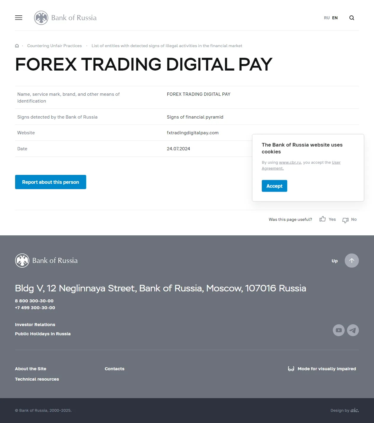 Nama, tanda layanan, merek, dan sarana identifikasi lainnya Forex TRADING DIGITAL PAY Tanda yang terdeteksi oleh Bank Rusia Tanda piramida keuangan Situs web fxtradingdigitalpay.com Tanggal 24.07.2024.