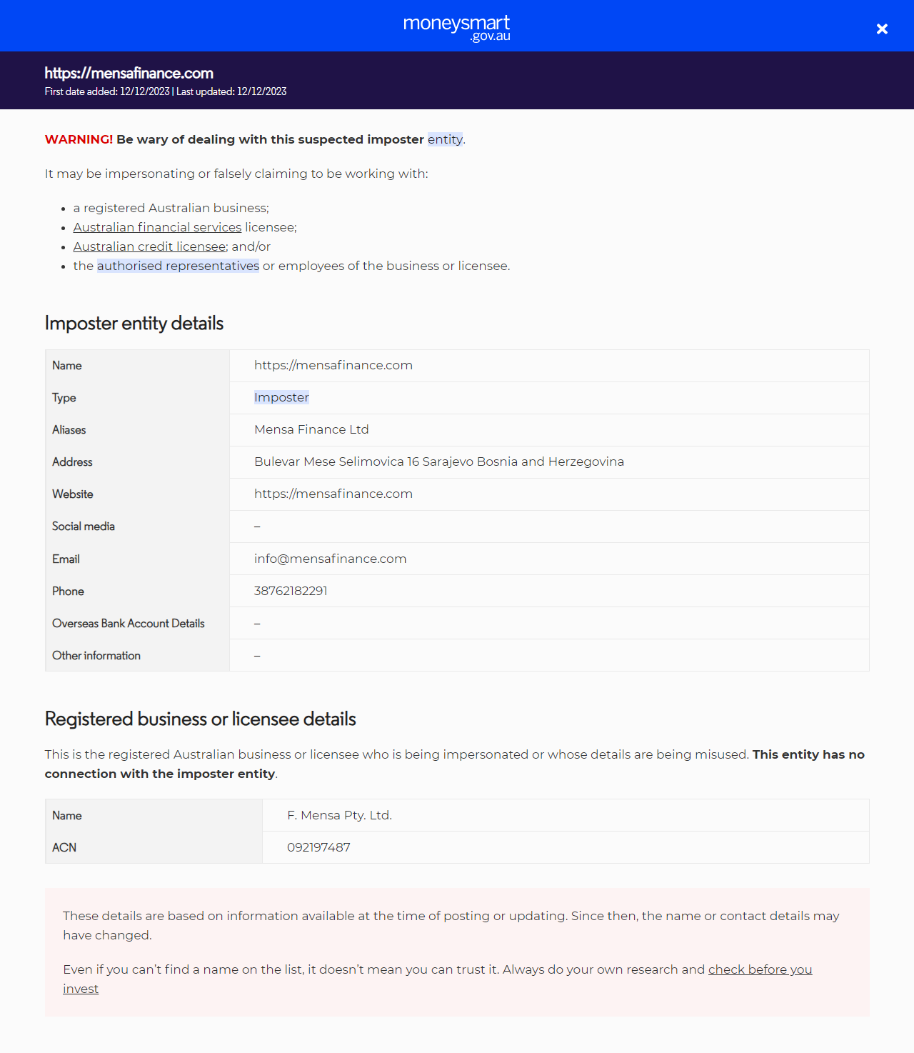 Namahttps://mensafinance.com TypeImposterMeniru bisnis terdaftar Australia, layanan keuangan Australia (AFS) atau pemegang lisensi kredit, atau perwakilan atau karyawan dari ini. AliasMensa Finance Ltd AlamatBulevar Mese Selimovica 16 Sarajevo Bosnia dan Herzegovina Situs webhttps://mensafinance.com Media sosial– Emailinfo@mensafinance.com Telepon38762182291 Detail Rekening Bank Luar Negeri– Informasi lain–.