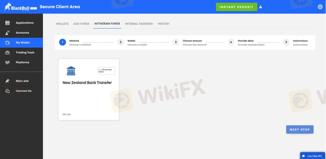 BlackBulloffre ai suoi clienti molteplici opzioni per depositare e prelevare fondi, tra cuibonifico bancario, POLi e carta di credito/debito (Visa/MasterCard). Le valute di base sonoUSD e NZD.