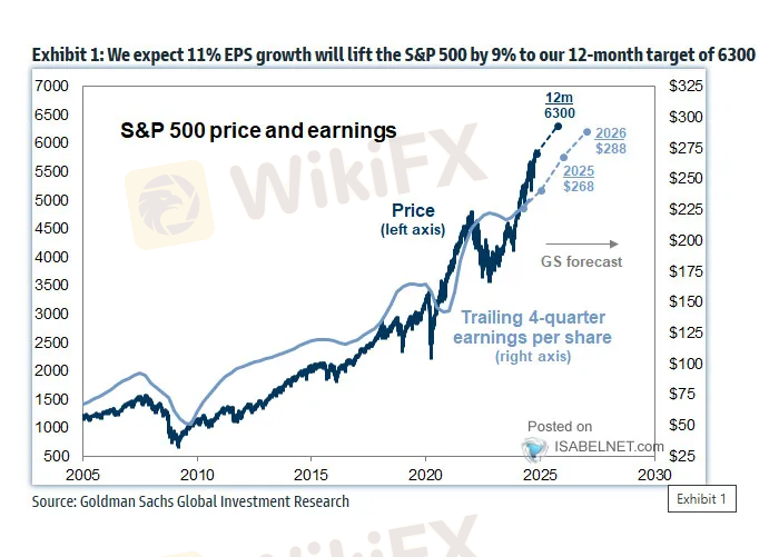 According to Goldman Sachs Global Investment Research's forecast, we expect the S&P 500 index to rise 9% in the next 12 months, reaching a target of 6300 points. This forecast is based on the premise that S&P 500 earnings per share (EPS) will grow by 11%.