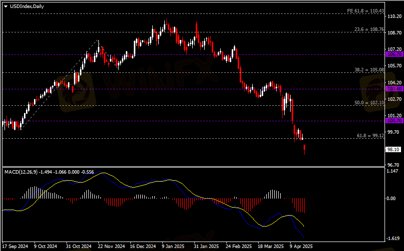 日线图显示美元指数低开走弱,当前承压于前低99.10。从MACD来看,快慢线向下扩张,红色动能柱恢复放量。指数走势基本和动能柱的变化一致。