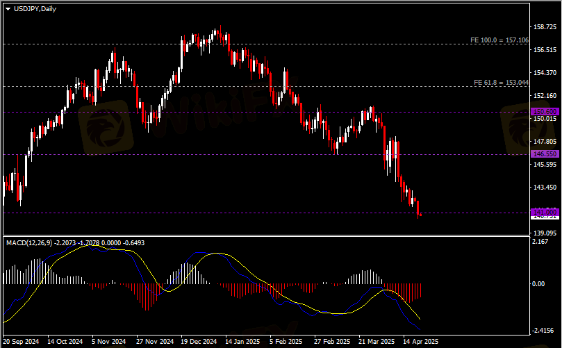 日线图显示美元兑日元震荡下跌,当前测试141关键支撑。从MACD来看,快慢线向下运行,红色动能柱则温和收缩。汇价走势和动能柱的变化呈分歧。