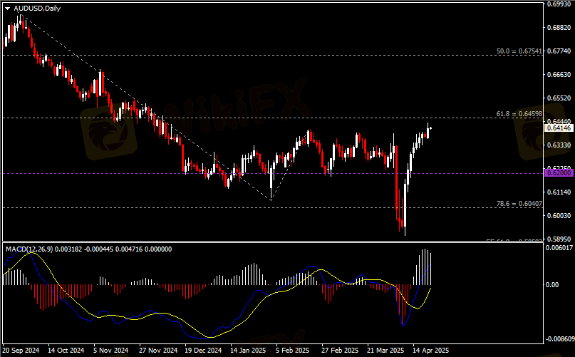 日线图显示澳元兑美元震荡上涨,当前逼近0.6460阻力。从MACD来看,快慢线向上扩张,白色动能柱则温和收缩。汇价走势和动能柱的变化呈分歧。