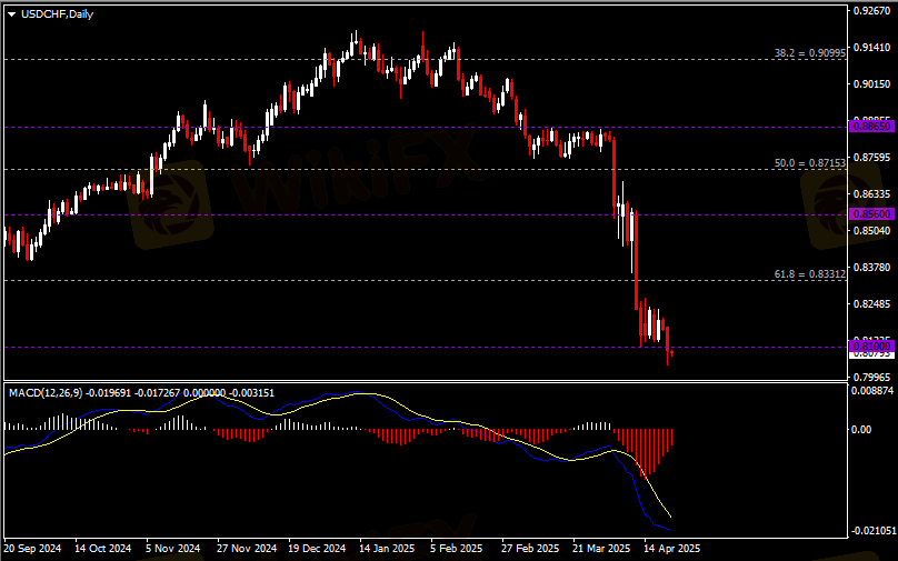 日线图显示美元兑瑞郎震荡下挫,当前测试0.81关键支撑。从MACD来看,快慢线呈拐向,红色动能柱温和收缩。汇价走势和动能柱的变化呈分歧。