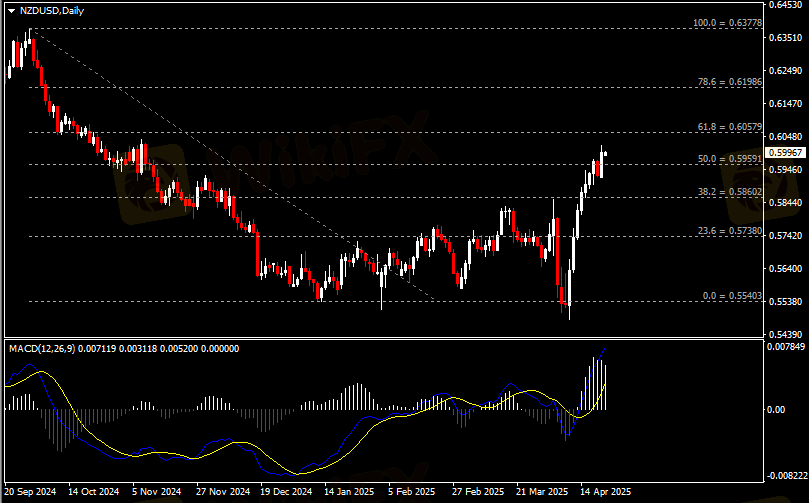 日线图显示纽元兑美元震荡上行,当前收于前高0.5960。从MACD来看,快慢线向上扩张,白色动能柱则温和收缩。汇价走势和动能柱的变化呈分歧。