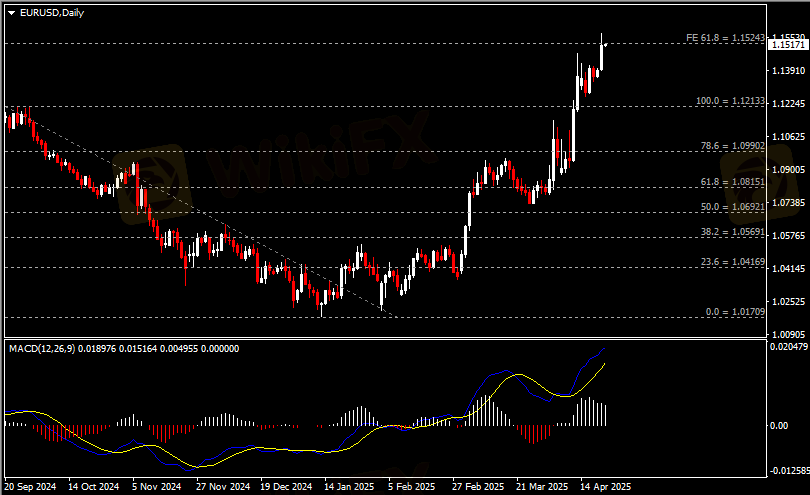 日线图显示欧元兑美元震荡上涨,当前测试1.1520阻力。从MACD来看,快慢线向上运行,白色动能柱则温和收缩。汇价走势和动能柱的变化呈分歧。