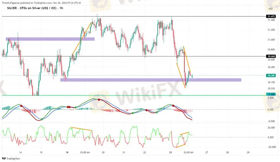 SILVER - Silver prices experienced a sell-off, breaking below the previous swing low. A complete shift in price momentum is anticipated once there is a clear break below this level. The RSI suggests a potential pullback from the current price zone, while the MACD shows weakening volume and momentum. Despite this, the relevance of the swing low supports the continuation of the bearish trend.