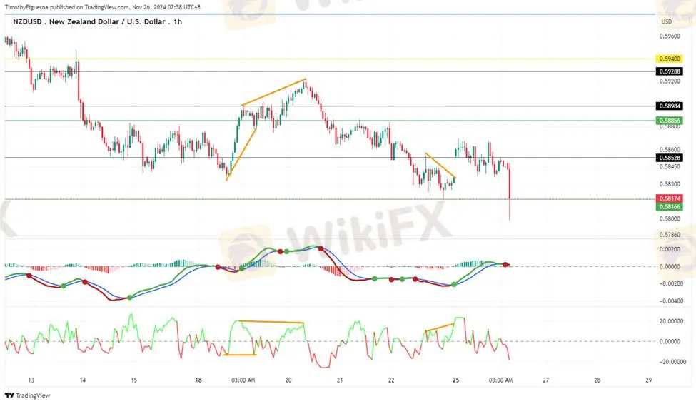 NZDUSD - The Kiwi mirrors the Australian dollar's movement, with strong selling momentum evident in both the MACD and RSI. Price action also confirms this bearish trend, maintaining the focus on selling opportunities in this market.