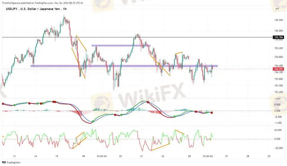 USDJPY - The yen's strength remains consistent but has reached a standstill against the dollar. While it shows enough strength to approach lower levels, it has yet to break below the previous low. With both the RSI and MACD reflecting consolidated movement, the outlook for the yen remains neutral.