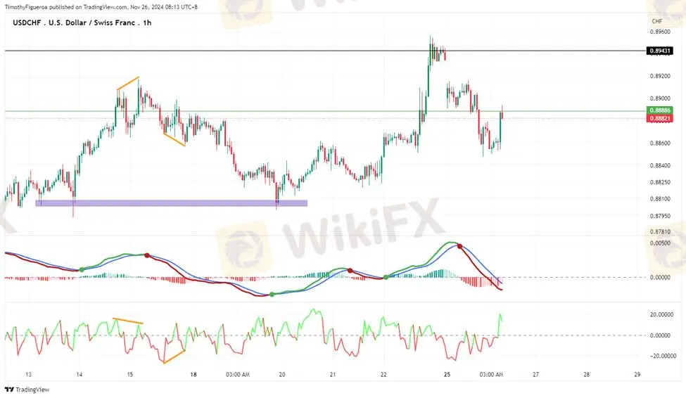 USDCHF - The franc maintains bullish momentum, with a pullback from Monday's weaker dollar being evident. After this pullback, the price is expected to resume its bullish trend in upcoming sessions. The RSI indicates a shift toward bullish momentum, though the MACD suggests some price weakness with lighter prints hinting at a potential upward cross.