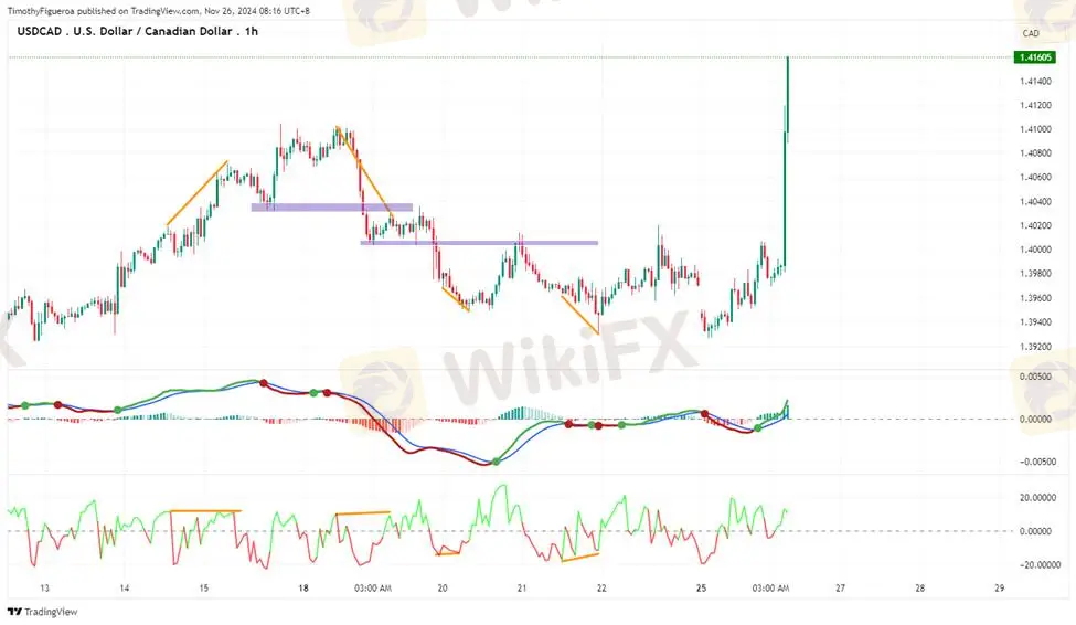 USDCAD - The Canadian dollar opened the session with a sudden burst of weakness, erasing recent gains. This followed news of the Israel-Lebanon ceasefire deal, which eased concerns over oil prices. The prospect of falling oil prices poses challenges to Canadas growth and profit, negatively impacting the currency's value.