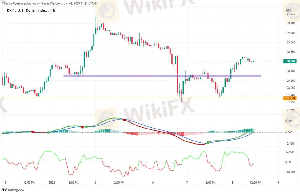 DXY - Dollar prices strengthened as predicted, supported at 107.834. Increased bullish momentum is evident, with the RSI printing exaggerated levels despite minor downward price movements. The MACD is also reflecting heightened bullish momentum, and the overall price action signals growing buying pressure and volume.