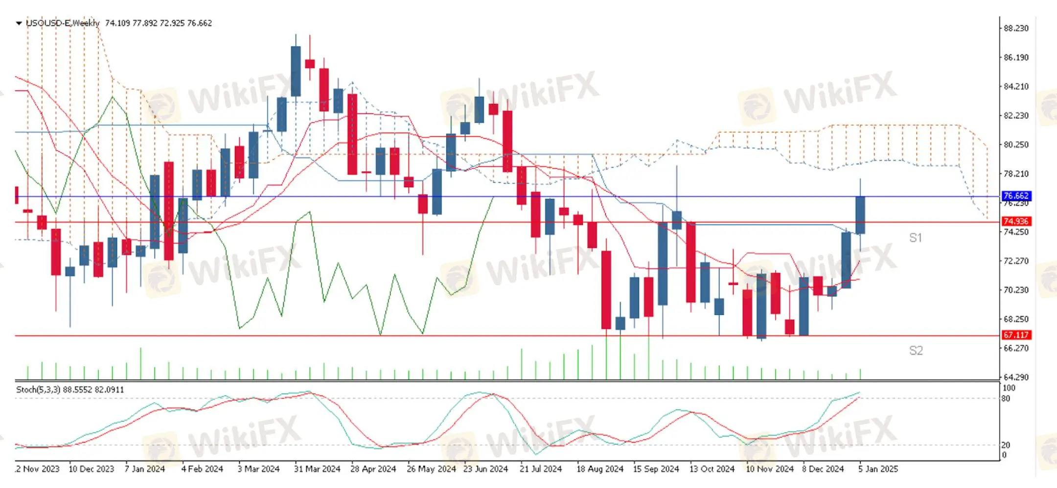 USOUSD has broken through Support 1 at 74.936 and is currently traded around 76.662, indicating a bullish momentum. However, the stochastic indicator is approaching overbought levels near 80, suggesting a potential trend reversal if buying pressure diminishes.
