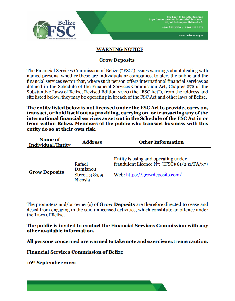 avviso di avvertimento Grow Deposits la commissione per i servizi finanziari del belize ("fsc") emette avvertimenti sui rapporti con persone nominate, siano esse persone fisiche o società, per allertare il pubblico e il settore dei servizi finanziari che, laddove tale persona offra servizi finanziari internazionali come definito nel programma di della legge sulla commissione dei servizi finanziari, capitolo 272 delle leggi sostanziali del belize, edizione rivista 2020 (la "legge fsc"), dall'indirizzo e dal sito elencati di seguito, potrebbero operare in violazione della legge fsc e di altre leggi del belize. l'entità elencata di seguito non è autorizzata ai sensi della legge fsc a fornire, svolgere, effettuare transazioni o ritenersi di fornire, svolgere o effettuare transazioni di servizi finanziari internazionali come indicato nell'allegato della legge fsc in o da all'interno del belize. i membri del pubblico che effettuano transazioni commerciali con questa entità lo fanno a proprio rischio. nome della persona fisica/ente indirizzo altre informazioni Grow Deposits rafael damianou street, 3 8359 nicosia entità utilizza e opera con licenza fraudolenta n.: (ifsc)(61/291/fa/37) web: https://growdeposits.com/ i promotori e/o i proprietari di Grow Deposits sono pertanto invitati a cessare e astenersi dall'impegnarsi in dette attività non autorizzate, che costituiscono un reato ai sensi delle leggi del Belize. il pubblico è invitato a contattare la commissione per i servizi finanziari con qualsiasi altra informazione disponibile. si invitano tutti gli interessati a prenderne atto e ad esercitare la massima cautela. commissione per i servizi finanziari del belize 16 settembre 2022