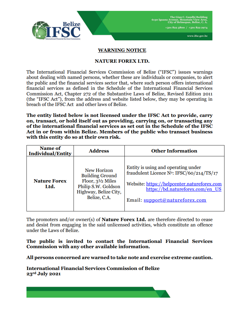 avviso di avvertimento NATURE FOREX LTD. la commissione internazionale per i servizi finanziari del Belize ("ifsc") emette avvertimenti sui rapporti con persone nominate, siano esse persone fisiche o società, per avvisare il pubblico e il settore dei servizi finanziari che, laddove tale persona offra servizi finanziari internazionali come definito nel programma della legge della Commissione internazionale per i servizi finanziari, capitolo 272 delle leggi sostanziali del Belize, edizione rivista 2011 (la "legge ifsc"), dall'indirizzo e dal sito Web elencati di seguito, potrebbero operare in violazione della legge ifsc e di altre leggi del belize. l'entità elencata di seguito non è autorizzata ai sensi dell'ifsc act a fornire, svolgere, effettuare transazioni o ritenersi di fornire, svolgere o effettuare transazioni di servizi finanziari internazionali come indicato nell'allegato dell'ifsc act in o da all'interno del belize. i membri del pubblico che effettuano transazioni commerciali con questa entità lo fanno a proprio rischio. nome della persona fisica/ente indirizzo altre informazioni Nature Forex ltd. nuovo orizzonte edificio piano terra, 3½ miglia philip sw goldson highway, belize city, belize, ca entità utilizza e opera con licenza fraudolenta n.: ifsc/60/214/ts/17 sito web: https://helpcenter.natureforex.com https ://bd.natureforex.com/en_us email: support@natureforex.com i promotori e/o i proprietari di NATURE FOREX LTD. sono pertanto invitati a cessare e astenersi dall'impegnarsi in dette attività non autorizzate, che costituiscono un reato ai sensi delle leggi del Belize. il pubblico è invitato a contattare la commissione internazionale per i servizi finanziari con qualsiasi altra informazione disponibile. tutti gli interessati sono invitati a prenderne atto e ad esercitare la massima cautela. commissione internazionale per i servizi finanziari del belize 23 luglio 2021