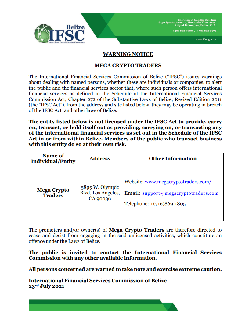 avviso di avvertimento Mega Crypto Traders la commissione internazionale per i servizi finanziari del Belize ("ifsc") emette avvertimenti sui rapporti con persone nominate, siano esse persone fisiche o società, per avvisare il pubblico e il settore dei servizi finanziari che, laddove tale persona offra servizi finanziari internazionali come definito nel programma della legge della Commissione internazionale per i servizi finanziari, capitolo 272 delle leggi sostanziali del Belize, edizione rivista 2011 (la "legge ifsc"), dall'indirizzo e dal sito elencati di seguito, potrebbero operare in violazione della legge ifsc e di altre leggi del belize. l'entità elencata di seguito non è autorizzata ai sensi dell'ifsc act a fornire, svolgere, effettuare transazioni o ritenersi di fornire, svolgere o effettuare transazioni di servizi finanziari internazionali come indicato nell'allegato dell'ifsc act in o da all'interno del belize. i membri del pubblico che effettuano transazioni commerciali con questa entità lo fanno a proprio rischio. nome della persona fisica/entità indirizzo altre informazioni mega crypto traders 5895 w. viale olimpico. los angeles, ca 90036 sito web: www.megacryptotraders.com/ email: support@megacryptotraders.com telefono: +(716)869-1805 i promotori e/o i proprietari di Mega Crypto Traders sono pertanto invitati a cessare e astenersi dall'impegnarsi in dette attività non autorizzate, che costituiscono un reato ai sensi delle leggi del Belize. il pubblico è invitato a contattare la commissione internazionale per i servizi finanziari con qualsiasi altra informazione disponibile. tutti gli interessati sono invitati a prenderne atto e ad esercitare la massima cautela. commissione internazionale per i servizi finanziari del belize 23 luglio 2021