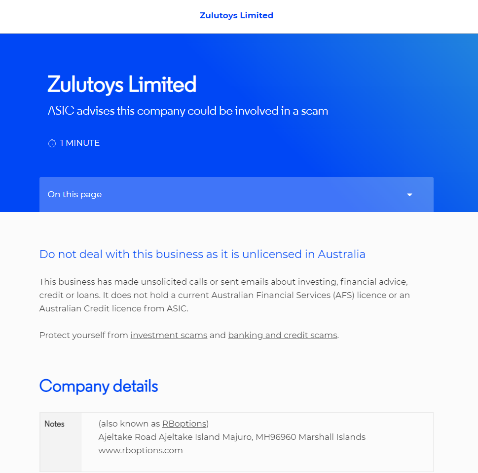 Zulutoys Limited ASIC avvisa che questa azienda potrebbe essere coinvolta in una truffa TEMPO DI LETTURA DELLA PAGINA: 1 MINUTO In questa pagina Non occuparti di questa attività poiché non è autorizzata in Australia Questa azienda ha effettuato chiamate indesiderate o inviato e-mail su investimenti, consulenza finanziaria, credito o prestiti. Non detiene una licenza AFS (Australian Financial Services) corrente o una licenza di credito australiano da ASIC. Proteggiti dalle truffe sugli investimenti e dalle truffe bancarie e creditizie. Dati societari Note (noto anche come RBoptions) Ajeltake Road Ajeltake Island Majuro, MH96960 Isole Marshall www.rboptions.com