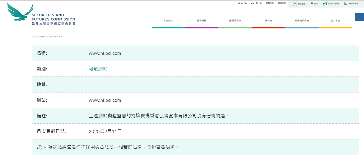 Nome: www.hkbcl.com Categoria: Sito Web sospetto Indirizzo: - Sito Web: www.hkbcl.com Osservazioni: Il sito Web di cui sopra non ha alcun collegamento con Hong Kong Hongbo Capital Limited, che è autorizzata dalla SFC. Data della prima pubblicazione: 11 febbraio 2020 Nota: gli operatori di siti Web sospetti utilizzano spesso nomi simili a società legittime, confondendo gli investitori. " L'elenco delle società senza licenza e dei siti Web sospetti elenca le società che non sono autorizzate a Hong Kong e che hanno attirato l'attenzione della SFC. Queste società sono sospettate di essere o stavano commercializzando a investitori di Hong Kong o affermano di avere legami con Hong Kong. Puoi cercare per nome o categoria per vedere se un'azienda è presente nell'elenco.Questo elenco non è esaustivo.Poiché l'SFC trova spesso aziende o siti Web degni di nota, di tanto in tanto ne vengono aggiunti di nuovi all'elenco.Se sei stato contattato da un'azienda non autorizzata, si prega di utilizzare il nostro modulo di reclamo online.Per ulteriori informazioni su locali caldaie, siti Web fraudolenti ed e-mail di phishing, fare clic sui collegamenti pertinenti. agli investitori. Gli investitori non possono fare affidamento esclusivamente sulle informazioni nell'elenco sopra riportato, devono controllare attentamente i dettagli delle singole società. Selezionare la prima lettera inglese del nome di ciascuna colonna per visualizzare l'elenco o fare clic su "Nome cinese" la colonna sfoglia solo le società con nomi cinesi."