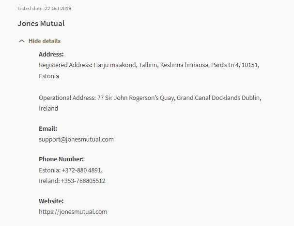 "elenco degli avvisi per gli investitori l'elenco degli avvisi per gli investitori fornisce un elenco di persone che, sulla base delle informazioni a disposizione di mas, i) potrebbero essere o potrebbero essere state erroneamente percepite come autorizzate o in altro modo autorizzate o regolamentate da mas; ii) hanno effettuato un'offerta di quote di un fondo d'affari o di un organismo di investimento collettivo che può essere o essere stata erroneamente percepita come autorizzata, riconosciuta o registrata da mas; iii) hanno fatto un'offerta di investimento che può essere o essere stata erroneamente percepita come redatto o accompagnato da un atto depositato o registrato presso mas. tale elenco non è esaustivo e si basa su quanto era noto a mas al momento della pubblicazione." data indicata: 22 ottobre 2019 Jones Mutual nascondi dettagli indirizzo: indirizzo registrato: harju maakond, tallinn, keslinna linnaosa, parda tn 4, 10151, estonia indirizzo operativo: 77 sir john rogerson's quay, grand canal docklands dublino, irlanda email: support@jonesmutual.com numero di telefono: estonia: + 372-880 4891, irlanda: +353-766805512 sito web: https://jonesmutual.com