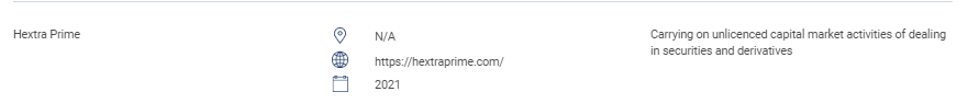 "questa sezione contiene l'elenco dei siti web, dei prodotti di investimento, delle società e delle persone fisiche non autorizzati. Questo elenco include: persone che svolgono o si dichiarano di svolgere le seguenti attività regolamentate senza una licenza da parte della sc: negoziazione di titoli; negoziazione di derivati; gestione di fondi; consulenza in materia di finanza aziendale; consulenza in materia di investimenti; pianificazione finanziaria; e gestione di regimi pensionistici privati. persone che operano in un mercato riconosciuto senza autorizzazione. persone che emettono o offrono titoli senza approvazione, autorizzazione o riconoscimento. persone che abusano del logo di sc e travisano la sc. " Hextra Prime n/a https://hextraprime.com/ 2021 svolgimento di attività non autorizzate sul mercato dei capitali di negoziazione di titoli e derivati