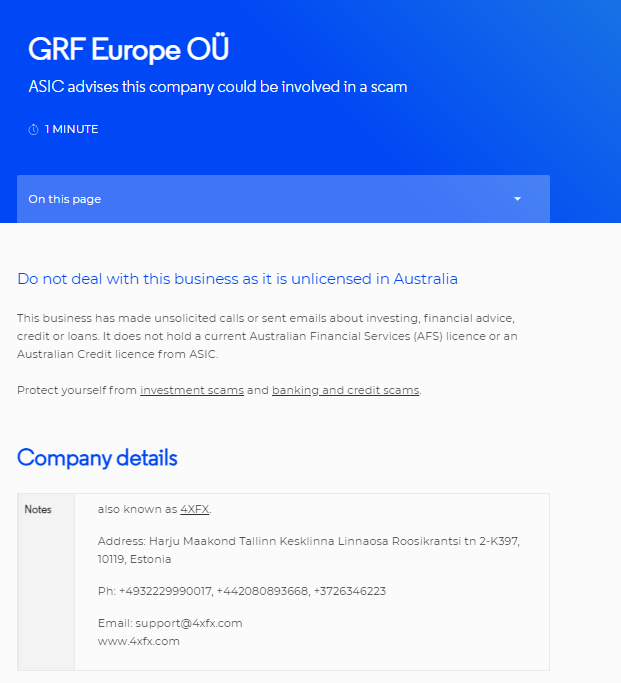 lista di allerta per gli investitori GRF Europe OÜ L'ASIC avvisa che questa società potrebbe essere coinvolta in una truffa.