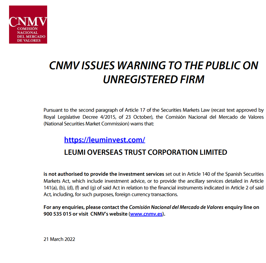 LEUMI OVERSEAS TRUST CORPORATION LIMITED(https:// Leuminvest .com) 23/03/2022 spagna cnmv avverte il pubblico sulle imprese non registrate ai sensi dell'articolo 17, secondo comma, della legge sui mercati mobiliari (testo rifuso approvato con regio decreto legislativo 4/2015, del 23 ottobre), la comisión nacional del mercado de valores (commissione nazionale per il mercato dei valori mobiliari) avverte che: LEUMI OVERSEAS TRUST CORPORATION LIMITED non è autorizzata a fornire i servizi di investimento di cui all'articolo 140 della legge spagnola sui mercati mobiliari, inclusa la consulenza in materia di investimenti, né a fornire i servizi accessori di cui all'articolo 141 (a), (b), (d), (f) e (g) della stessa legge in relazione agli strumenti finanziari indicati nell'articolo 2 della stessa legge, comprese, a tal fine, le operazioni in valuta estera. per qualsiasi domanda, si prega di contattare la linea di richiesta della comisión nacional del mercado de valores al numero 900 535 015 o visitare il sito web di cnmv (www.cnmv.es). 21 marzo 2022.