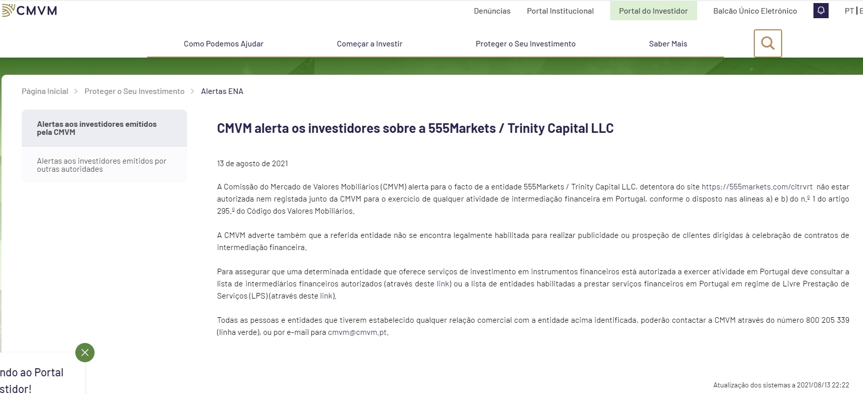 cmvm mette in guardia gli investitori sulla 555Markets / Trinity Capital LLC