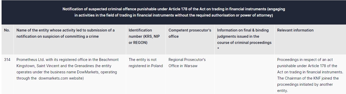 prometheus ltd. con sede legale a beachmont kingstown, saint vincent e grenadine (l'entità opera sotto la ragione sociale DowMarkets , operando attraverso la DowMarkets .com) l'entità non è registrata presso l'ufficio del procuratore regionale della Polonia a Varsavia procedimento in relazione a un atto punibile ai sensi dell'articolo 178 della legge sulla negoziazione di strumenti finanziari. Il presidente del KNF si è unito al procedimento avviato da un'altra entità.