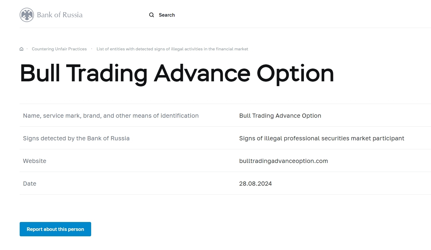 nome, marchio di servizio, marchio e altri mezzi di identificazione Bull Trading Advance Option segnali rilevati dalla banca di russia segnali di partecipazione illegale al mercato dei titoli professionali sito web bulltradingadvanceoption.com data 28.08.2024