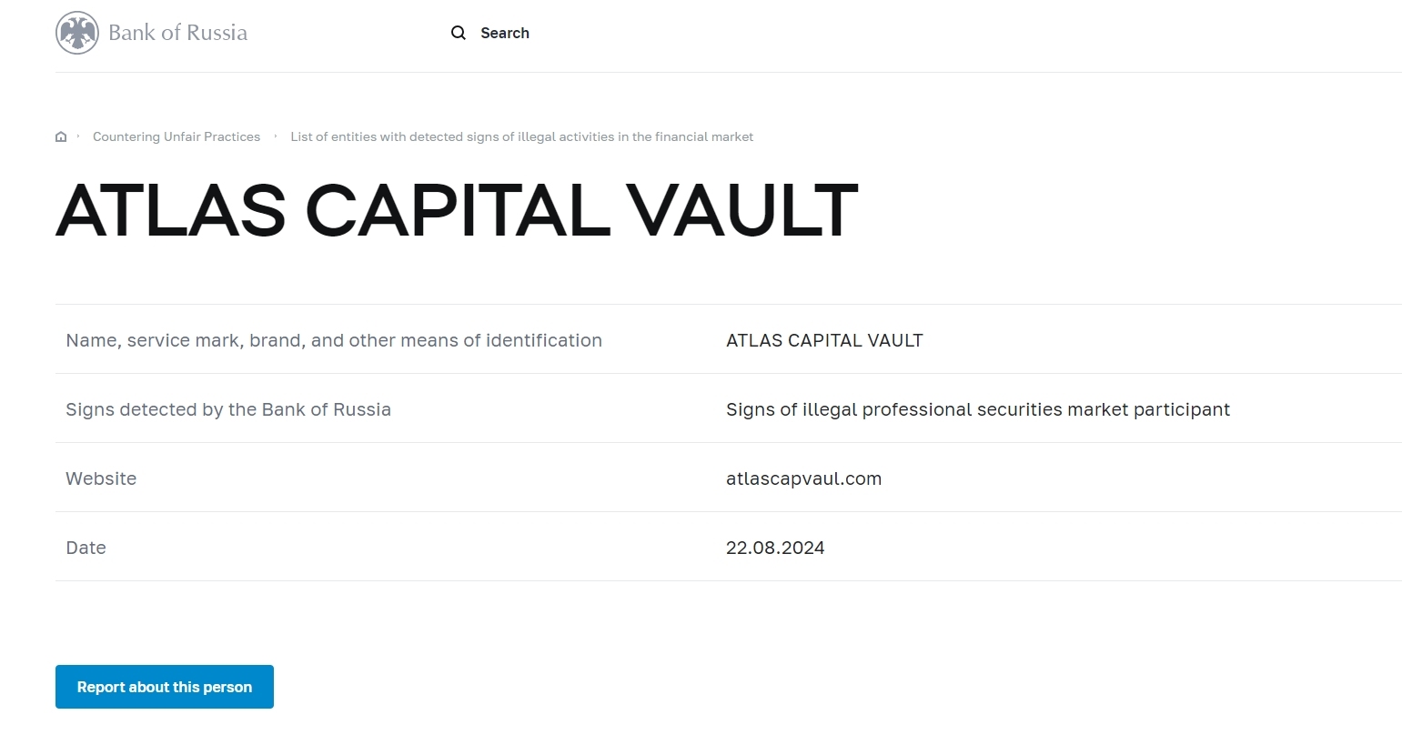 nome, marchio di servizio, marchio e altri mezzi di identificazione ATLAS CAPITAL VAULT segnali rilevati dalla banca di russia segnali di partecipazione al mercato dei titoli professionali illegali sito web atlascapvaul.com data 22.08.2024