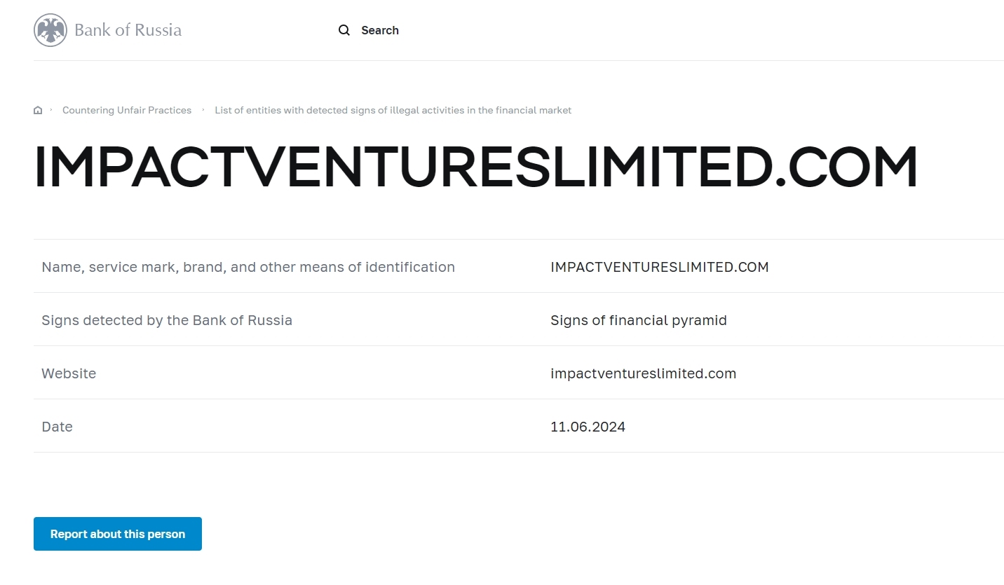 Nome, marchio di servizio, brand e altri mezzi di identificazione IMPACTVENTURESLIMITED.COM Segnali rilevati dalla Banca di Russia Segnali di piramide finanziaria Sito web impactventureslimited.com Data 11.06.2024