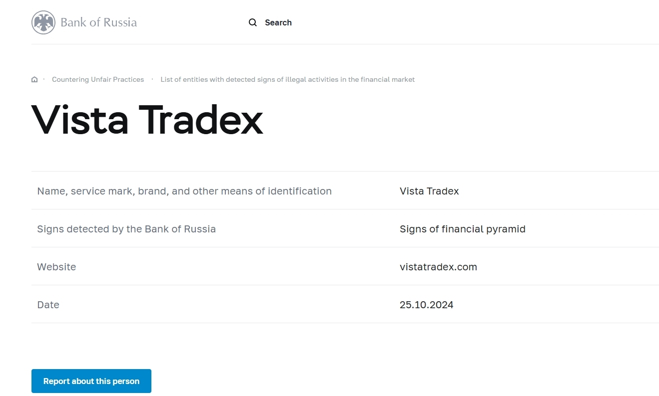 nome, marchio di servizio, marchio e altri mezzi di identificazione Vista Tradex segnali rilevati dalla banca di russia segnali di piramide finanziaria sito web vistatradex.com data 25.10.2024