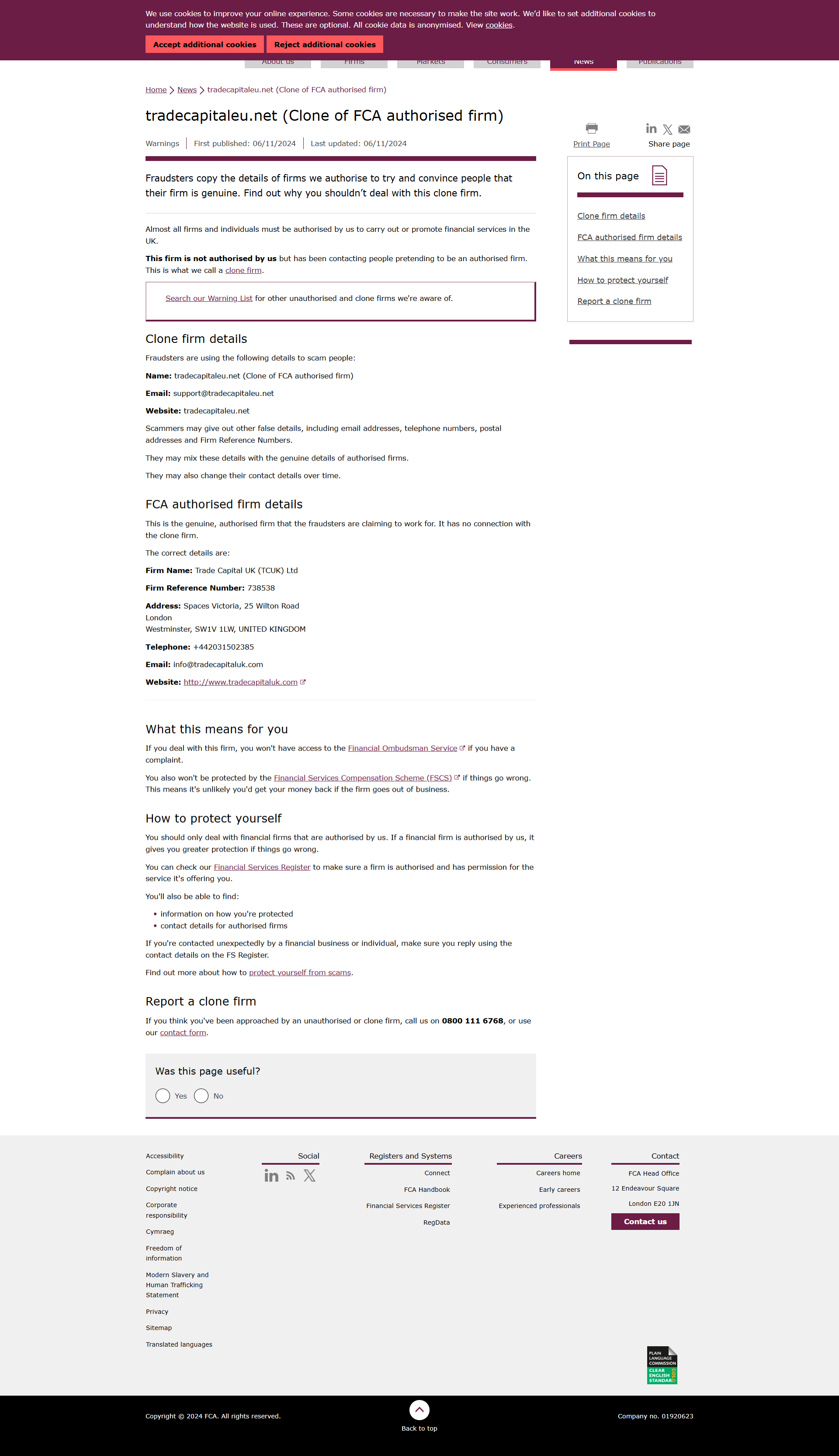 Avvertenze Prima pubblicazione: 06/11/2024 Ultimo aggiornamento: 06/11/2024 I truffatori copiano i dettagli delle aziende da noi autorizzate per cercare di convincere le persone che la loro azienda è autentica. Scopri perché non dovresti avere a che fare con questa azienda clone. Quasi tutte le aziende e gli individui devono essere autorizzati da noi per svolgere o promuovere servizi finanziari nel Regno Unito. Questa azienda non è autorizzata da noi, ma ha contattato persone che fingono di essere un'azienda autorizzata. Questo è ciò che chiamiamo un'azienda clone. Cerca nel nostro Elenco di avvisi altre aziende non autorizzate e clone di cui siamo a conoscenza. Dettagli dell'azienda clone I truffatori utilizzano i seguenti dettagli per truffare le persone: Nome: tradecapitaleu.net (clone di azienda autorizzata dalla FCA) E-mail: support@tradecapitaleu.net Sito Web: tradecapitaleu.net I truffatori possono fornire altri dettagli falsi, tra cui indirizzi e-mail, numeri di telefono, indirizzi postali e numeri di riferimento dell'azienda. Possono mescolare questi dettagli con i dettagli autentici delle aziende autorizzate. Possono anche modificare i loro dati di contatto nel tempo.