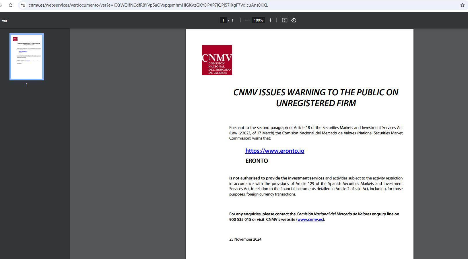 La cnmv emette un avviso al pubblico sulle società non registrate ai sensi del secondo comma dell'articolo 18 della legge sui mercati mobiliari e sui servizi di investimento (legge 6/2023, del 17 marzo). La comisión nacional del mercado de valores (commissione nazionale del mercato mobiliare) avverte che: https://www. ERonto .io ERonto non è autorizzata a prestare i servizi e le attività di investimento soggetti alla restrizione delle attività in conformità con le disposizioni dell'articolo 129 della legge spagnola sui mercati mobiliari e sui servizi di investimento, in relazione agli strumenti finanziari dettagliati nell'articolo 2 di detta legge, comprese, a tali fini, le transazioni in valuta estera. Per qualsiasi informazione, contattare la linea di informazioni della comisión nacional del mercado de valores al numero 900 535 015 o visitare il sito web della cnmv (www.cnmv.es). 25 novembre 2024
