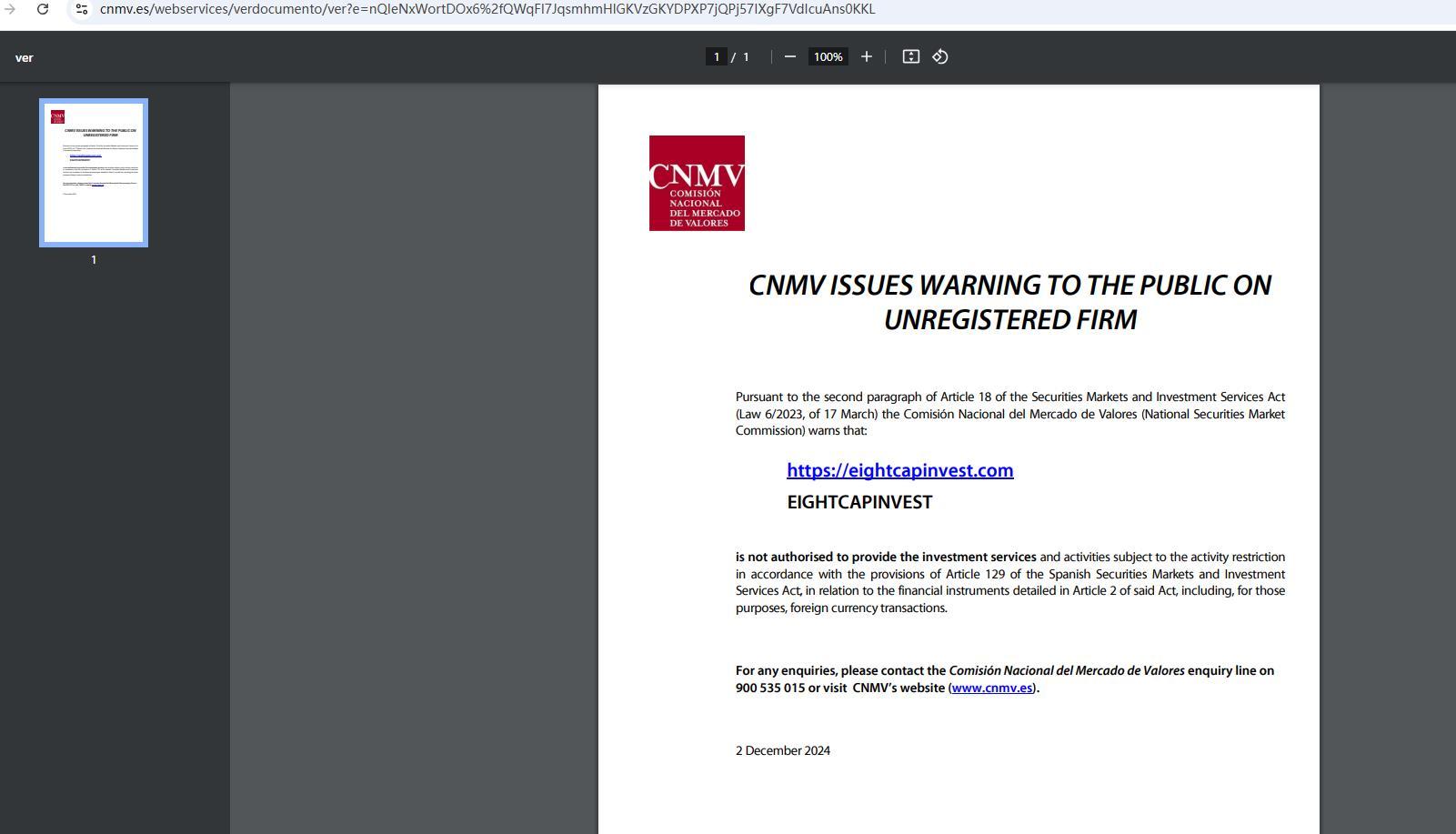 cnmv emette un avviso al pubblico sulle società non registrate ai sensi del secondo comma dell'articolo 18 della legge sui mercati mobiliari e sui servizi di investimento (legge 6/2023, del 17 marzo) la comisión nacional del mercado de valores (commissione nazionale del mercato mobiliare) avverte che: https:// EightCapInvest .com EightCapInvest non è autorizzata a prestare i servizi e le attività di investimento soggetti alla restrizione delle attività in conformità con le disposizioni dell'articolo 129 della legge spagnola sui mercati mobiliari e sui servizi di investimento, in relazione agli strumenti finanziari dettagliati nell'articolo 2 di detta legge, comprese, a tali fini, le transazioni in valuta estera. Per qualsiasi informazione, contattare la linea di informazioni della comisión nacional del mercado de valores al numero 900 535 015 o visitare il sito web della cnmv (www.cnmv.es). 2 dicembre 2024