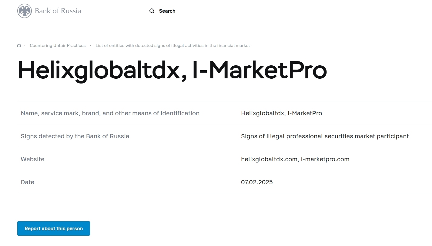 Nome, marchio di servizio, brand e altri mezzi di identificazione Helixglobaltdx, I-MarketPro Segnali rilevati dalla Banca di Russia Segnali di partecipante al mercato dei titoli professionali illegali Sito web helixglobaltdx.com, i-marketpro.com Data 07.02.2025