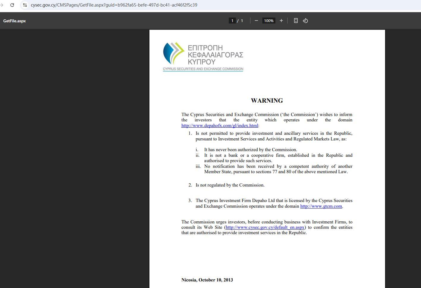 Avviso La Cyprus Securities and Exchange Commission ('la Commissione') desidera informare gli investitori che l'entità che opera sotto il dominio http://www.depahofx.com/gl/index.html: 1. non è autorizzata a fornire servizi di investimento e accessori nella Repubblica, ai sensi della legge sui servizi e sulle attività di investimento e sui mercati regolamentati, in quanto: i. non è mai stata autorizzata dalla Commissione. ii. non è una banca o una società cooperativa, costituita nella Repubblica e autorizzata a fornire tali servizi. iii. non è stata ricevuta alcuna notifica da un'autorità competente di un altro Stato membro, ai sensi delle sezioni 77 e 80 della legge sopra menzionata. 2. non è regolamentata dalla Commissione. 3. la società di investimento cipriota Depaho Ltd, autorizzata dalla Cyprus Securities and Exchange Commission, opera sotto il dominio http://www. GTCM .com. la commissione esorta gli investitori, prima di condurre affari con le società di investimento, a consultare il suo sito web (http://www.cysec.gov.cy/default_en.aspx) per confermare le entità autorizzate a fornire servizi di investimento nella repubblica. nicosia, 10 ottobre 2013