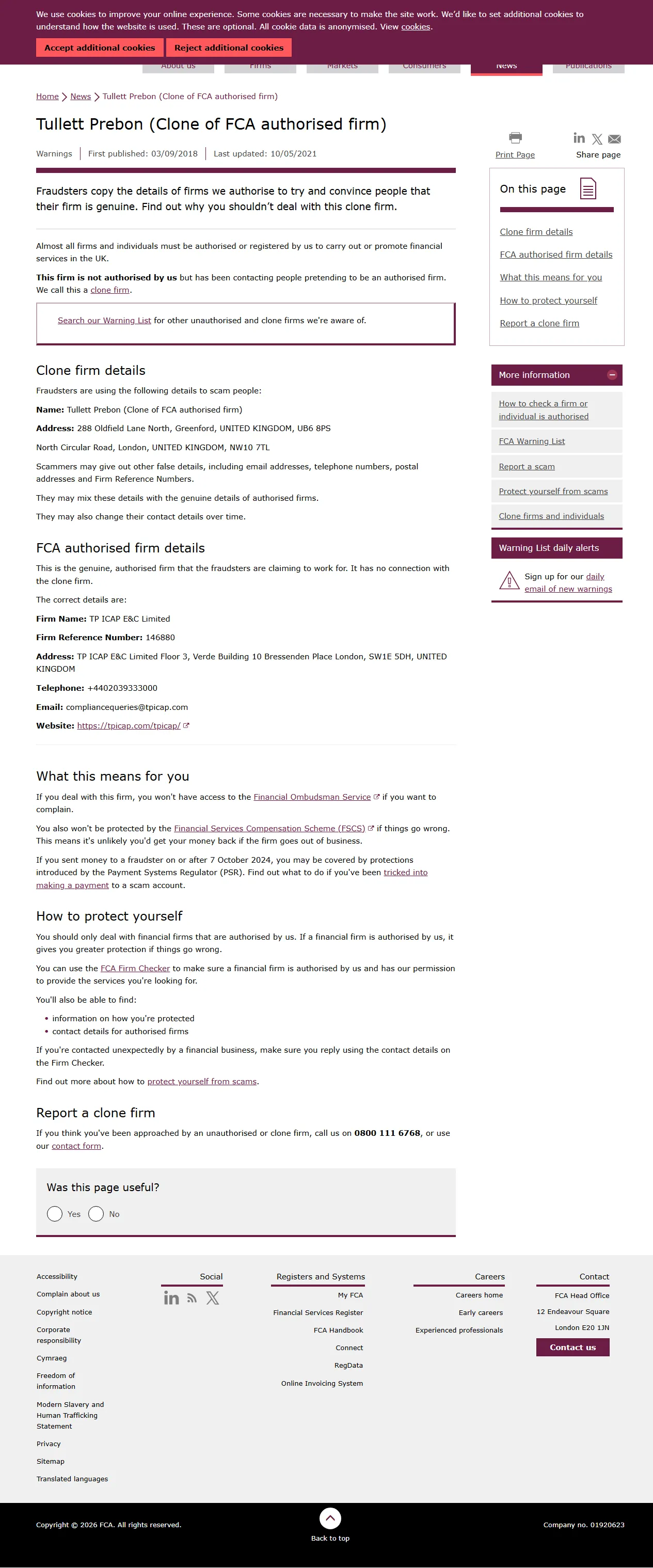 ['I truffatori copiano i dettagli delle aziende che autorizziamo per cercare di convincere le persone che la loro azienda sia genuina. Scopri perché non dovresti trattare con questa azienda clone. Quasi tutte le aziende e gli individui devono essere autorizzati o registrati da noi per svolgere o promuovere servizi finanziari nel Regno Unito. Questa azienda non è autorizzata da noi ma ha contattato persone fingendo di essere un'azienda autorizzata. Noi call questa un'azienda clone. Cerca nella nostra Lista di Avvisi altre aziende non autorizzate e clone di cui siamo a conoscenza. Dettagli dell'azienda clone I truffatori stanno utilizzando i seguenti dettagli per Scam le persone: Nome: Tullett Prebon (Clone di azienda autorizzata FCA) Indirizzo: 288 Oldfield Lane North, Greenford, REGNO UNITO, UB6 8PSNorth Circular Road, Londra, REGNO UNITO, NW10 7TL I truffatori potrebbero fornire altri dettagli falsi, inclusi indirizzi email, numeri di telefono, indirizzi postali e numeri di riferimento aziendale. Potrebbero mescolare questi dettagli con quelli genuini delle aziende autorizzate. Potrebbero anche cambiare i loro dettagli di contatto nel tempo. Dettagli dell'azienda autorizzata FCA Questa è la vera azienda autorizzata per cui i truffatori affermano di lavorare. Non ha alcuna connessione con l'azienda clone. I dettagli corretti sono: Nome Azienda: TP ICAP E&C Limited Numero di Riferimento Aziendale: 146880 Indirizzo: TP ICAP E&C Limited Piano 3, Edificio Verde 10 Bressenden Place Londra, SW1E 5DH, REGNO UNITO Telefono: +4402039333000 Email: compliancequeries@tpicap.com Sito web: https://tpicap.com/tpicap/ '].