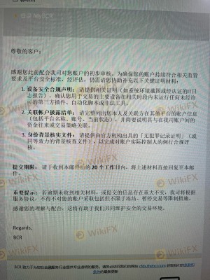 我在BCR做了几天交易,都是手动做单,然后总共盈利了900左右美金,在12月31那天,我申请了两次出金,然后就风控我,说我违规交易,冻结我账号,不给出金。客户经理说风控部门要处理15个工作日,今天是1月23号,收到邮件,让我提供什么系统管理,其他平台账号,无犯罪记录,真牛逼啊,这平台这么牛逼的啊,黑钱给找这么多高级的理由。