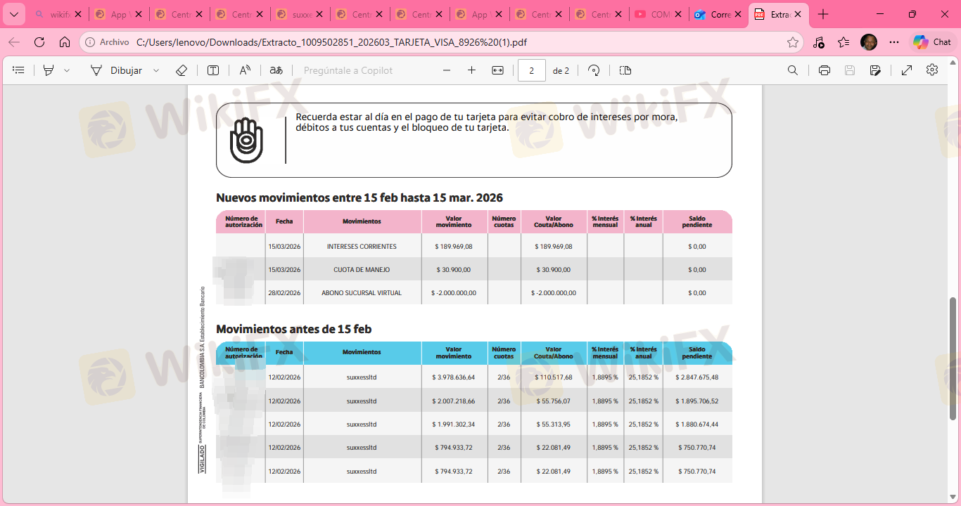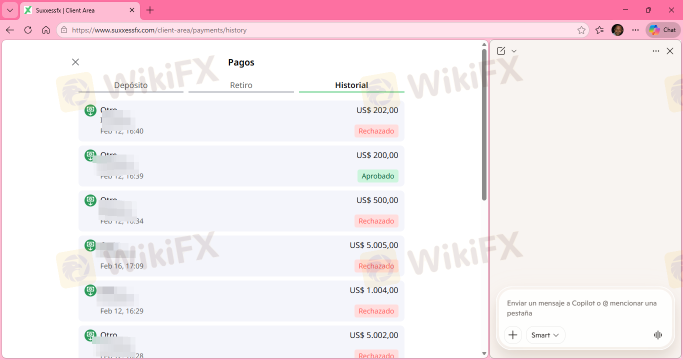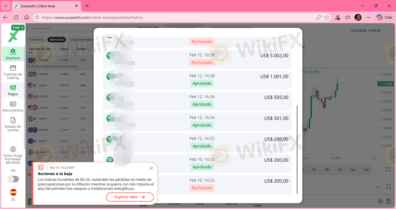 Buonasera. Due mesi fa, ho deciso di investire con suxxessfx. Sembravano un'azienda molto seria. La prima incongruenza che ho notato è stata che quando ho effettuato un prelievo di 200 dollari, ci sono voluti 25 giorni per arrivare sul mio conto. Tuttavia, quando depositano denaro, mi chiamano e mi dicono che devo depositare di più perché il prezzo dell'oro sta per salire. E infatti è salito e ho realizzato un profitto, ma anche se non avevo perdite nel mio conto, il prelievo non era possibile a causa del tipo di conto. Quindici giorni dopo, mi hanno chiamato dicendo che il mio margine era troppo basso e che dovevo ottenere 6.000 dollari entro due ore per cambiare il tipo di conto, anche solo per un mese, perché mi avrebbero fornito supporto in modo che il mio margine non scendesse di nuovo e potessi stare tranquillo. Cinque giorni Dopo aver depositato, mi hanno detto che dovevo depositare di nuovo perché dovevano ritirare il loro supporto a causa della politica aziendale 1, che stabilisce che entro il 31 dovevo depositare $11.000 altrimenti avrei perso tutto il mio capitale. Non mantengono la parola.