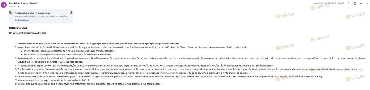 Il giorno 04/03/2026 ho creato il mio conto presso il broker Dooprime e il 05/03/2026 ho richiesto un prelievo. Il mio prelievo è rimasto in analisi per 5 giorni e ho segnalato la cosa alla mia account manager, la quale mi ha chiesto di inviare tutti i dettagli via e-mail. Il 10/03/2026 il mio conto è stato bloccato e l'opzione di prelievo non esiste più. Mi hanno detto via e-mail che dovevo rispondere per ricevere il rimborso e che se non avessi risposto, il rimborso sarebbe stato effettuato con lo stesso metodo con cui avevo depositato. Sono passati 9 giorni dalla creazione e dalla richiesta di rimborso e non è successo niente. Non fidatevi di questo broker: non rispondono alle e-mail, non esiste una chat (la schermata della chat continua a caricare e non si carica mai). Cosa voglio? Solo il rimborso del mio deposito, che era di 100 USD. Allego tutti i messaggi scambiati via e-mail, chat e account manager via WhatsApp.