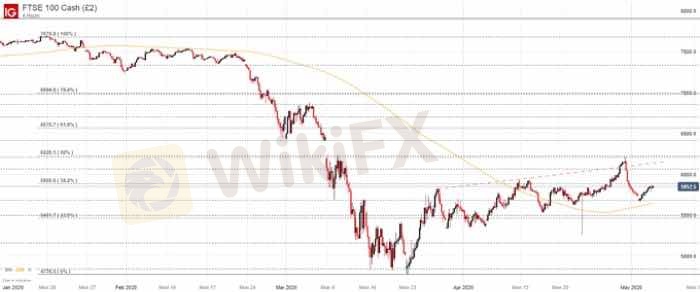 That being said, the FTSE is far from a position of power despite early signs that European and American cities have begun to ease restrictions. Therefore, one of the few bright spots for the index may exist in the series of higher highs and higher lows starting in late March and holding above the recent low around 5,670 will be crucial in keeping the formation alive.
