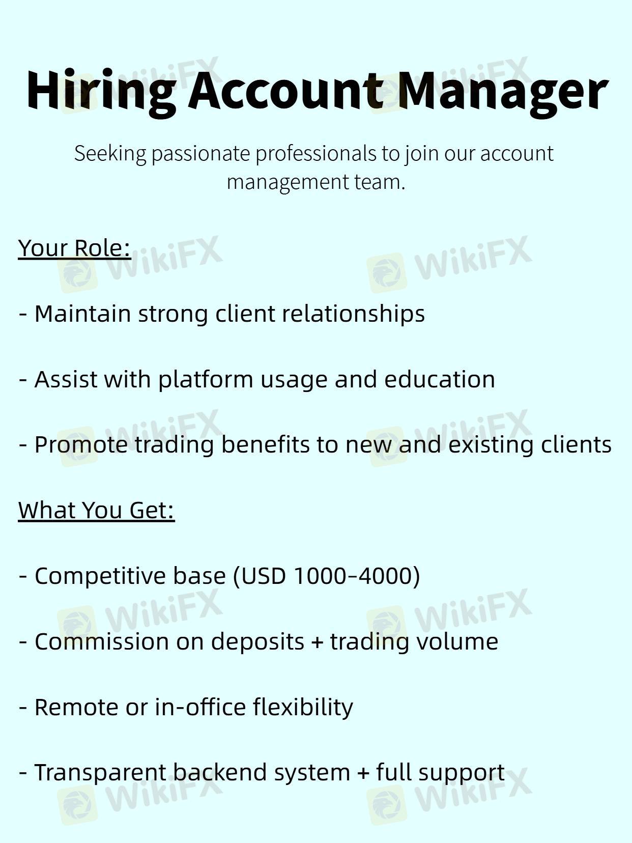 Seeking passionate professionals to join our account management team. Your Role: - Maintain strong client relationships - Assist with platform usage and education - Promote trading benefits to new and existing clients What You Get: - Competitive base (USD 1000–4000) - Commission on deposits + trading volume - Remote or in-office flexibility - Transparent backend system + full support