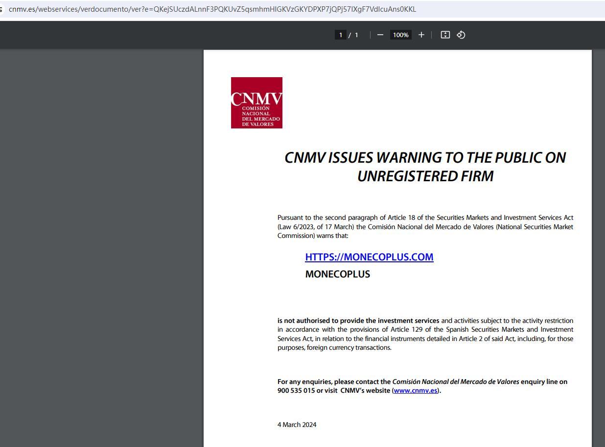 • Motivo della punizione https:// MonecoPlus .com MonecoPlus non è autorizzata a prestare servizi e attività di investimento soggetti a limitazione di attività in conformità con le disposizioni dell'articolo 129 della legge spagnola sui mercati mobiliari e sui servizi di investimento