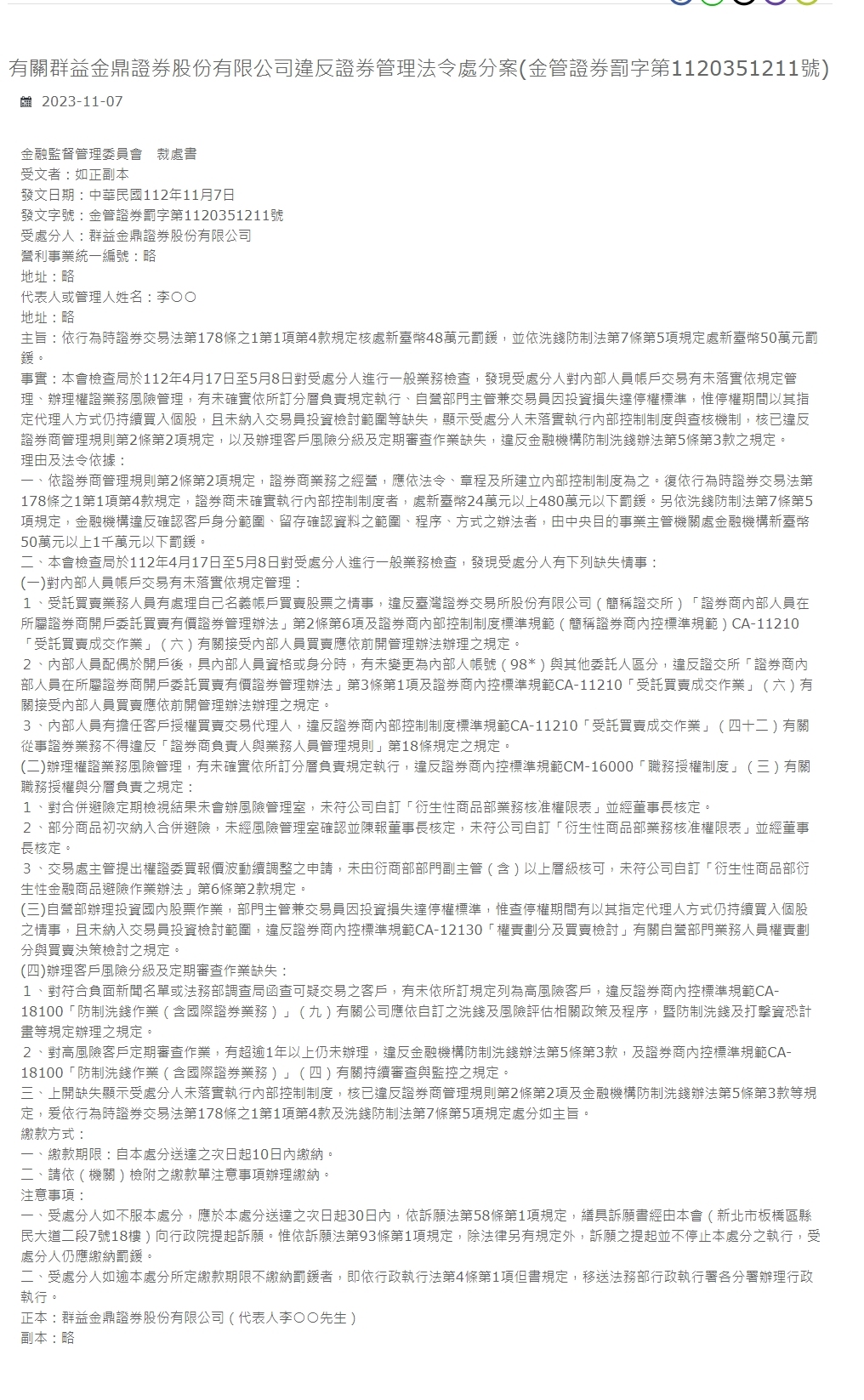 Lettera sanzionatoria della Financial Regulatory Commission Destinatario: Copia originale Data di emissione: 7 novembre 2012 Numero di emissione: Financial Management Securities Penalty No. 1120351211 Persona punita: Qunyi Jinding Securities Co., Ltd. Numero unificato di imprese a scopo di lucro: Indirizzo abbreviato: Abbreviato Nome del rappresentante o manager: Li ○○ Indirizzo: abbreviato Scopo: una multa di NT$ 480.000 è stata imposta ai sensi dell'articolo 178-1, paragrafo 1, paragrafo 4 del Securities and Exchange Act al momento dell'atto, e riciclaggio di denaro L'articolo 7, punto 5 della legge sulla prevenzione e il controllo prevede una multa di NT $ 500.000. Fatti: Dal 17 aprile all'8 maggio 2012, l'ufficio d'ispezione della Commissione ha condotto un'ispezione aziendale generale sulla persona punita e ha constatato che la persona punita non aveva attuato la gestione delle transazioni interne del conto personale in conformità con le normative e non aveva gestito gestione del rischio nell'attività dei warrant. Le norme di responsabilità gerarchica previste non vengono effettivamente attuate e il capo del dipartimento proprietario e trader raggiunge lo standard di sospensione a causa di perdite di investimenti. Tuttavia, durante il periodo di sospensione, continua ad acquistare singole azioni tramite il suo agente designato e non è incluso nell'ambito della revisione degli investimenti del trader e altre carenze, indicanti che la persona punita non ha implementato il sistema di controllo interno e il meccanismo di ispezione, ha violato le disposizioni dell'Articolo 2, Punto 2 dei Titoli Regole di gestione dei concessionari e non hanno gestito la classificazione dei rischi dei clienti e il lavoro di revisione periodica, violando le misure di prevenzione del riciclaggio di denaro degli istituti finanziari.Le disposizioni dell'articolo 5, paragrafo 3. Ragioni e base giuridica: 1. Secondo l'articolo 2, comma 2 del Regolamento di gestione dei commercianti di valori mobiliari, l'attività di una società di intermediazione mobiliare deve essere condotta in conformità con le leggi, gli statuti e il sistema di controllo interno istituito. In conformità con le disposizioni dell'articolo 178-1, paragrafo 1, paragrafo 4 del Securities and Exchange Act al momento dell'atto, una società di intermediazione mobiliare che non implementa il sistema di controllo interno sarà multata non meno di NT $ 240.000 ma non più di NT $ 4,8 milioni. Inoltre, ai sensi dell'articolo 7, paragrafo 5 della legge sulla prevenzione del riciclaggio di denaro, se un istituto finanziario viola l'ambito di conferma dell'identità del cliente, l'ambito, le procedure e i metodi di conservazione delle informazioni di conferma, l'autorità centrale competente del settore impone un multa non inferiore a NT$ 500.000 a carico dell'istituto finanziario. Una multa inferiore a 10 milioni di yuan. 2. Dal 17 aprile all'8 maggio 2020, l'Ufficio di ispezione della Camera di commercio ha effettuato un controllo aziendale generale sulla persona punita, riscontrando che la persona punita presentava le seguenti carenze: (1) Mancata gestione degli insider operazioni sui conti secondo le prescrizioni: 1. Il personale incaricato dell'attività commerciale effettua acquisti e vendite di azioni a proprio nome, il che viola il "Regolamento sull'amministrazione dei conti di apertura del personale interno dei commercianti di valori mobiliari presso i commercianti di valori mobiliari loro affiliati e Negoziazione affidata di titoli" della Borsa di Taiwan Co., Ltd. (di seguito denominata Borsa). Il punto 6 dell'articolo 2 e le Specifiche standard per i sistemi di controllo interno delle società di intermediazione mobiliare (di seguito le Specifiche standard per i sistemi di controllo interno delle società di intermediazione mobiliare) Control of Securities Firms) CA-11210 "Operazioni di negoziazione e transazione affidate" (6) stabilisce che l'accettazione di transazioni da parte di insider deve essere gestita in conformità con le precedenti norme di gestione. 2. Dopo l'apertura di un conto, il coniuge di un insider ha la qualifica o lo status di insider e non lo ha cambiato in un conto insider (98*) per distinguerlo da altri clienti, il che viola gli "Insider di valori mobiliari" della Borsa società di intermediazione mobiliare che aprono conti presso le loro società di intermediazione mobiliare affiliate per affidare la negoziazione" Il punto 1 dell'articolo 3 delle "Misure di gestione dei titoli" e CA-11210 "Operazioni di negoziazione e transazioni affidate" delle norme di controllo interno delle società di intermediazione mobiliare (6) stabiliscono che l'accettazione di transazioni da gli addetti ai lavori dovranno essere gestiti secondo le previgenti norme gestionali. 3. Gli addetti ai lavori agiscono come agenti commerciali autorizzati per i clienti e violano gli standard e i regolamenti dei sistemi di controllo interno delle società di valori mobiliari, CA-11210 "Operazioni di negoziazione e transazione affidate" (42). Quando si impegnano in attività di titoli, non devono violare il " Gestione dei responsabili e del personale commerciale delle società di intermediazione mobiliare” Si applicano le disposizioni dell'articolo 18 del Regolamento. (2) La gestione del rischio nell'attività dei warrant non è stata attuata in conformità con le norme di responsabilità gerarchica stabilite, il che viola gli standard di controllo interno delle società di intermediazione mobiliare CM-16000 "Sistema di autorizzazione al lavoro" (3) Disposizioni sull'autorizzazione al lavoro e alla responsabilità gerarchica : 1. I risultati delle ispezioni periodiche della copertura consolidata non saranno gestiti dall'ufficio di gestione del rischio e i risultati non saranno conformi all'elenco personalizzato della società "Business Approval Authority List for Derivatives Department" e non saranno approvati dal presidente del consiglio. 