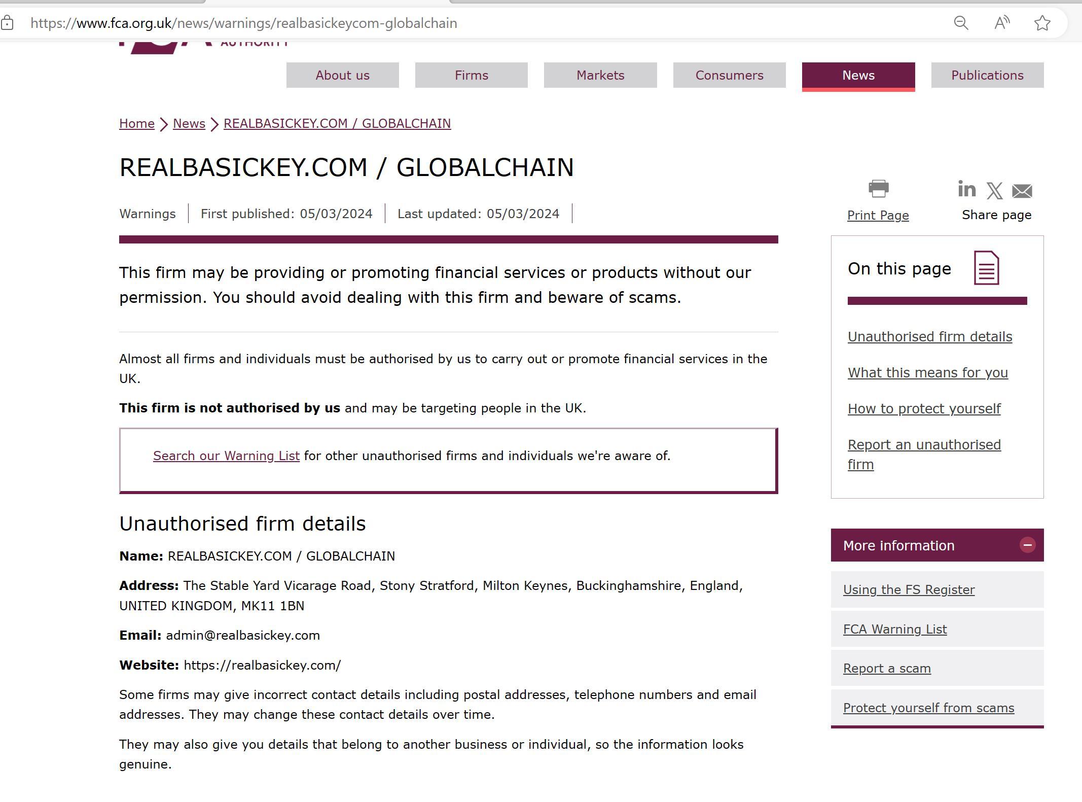 prima pubblicazione: 05/03/2024 ultimo aggiornamento: 05/03/2024 questa azienda potrebbe fornire o promuovere servizi o prodotti finanziari senza la nostra autorizzazione. dovresti evitare di trattare con questa azienda e fare attenzione alle truffe. quasi tutte le aziende e gli individui devono essere da noi autorizzati a svolgere o promuovere servizi finanziari nel Regno Unito. questa azienda non è autorizzata da noi e potrebbe prendere di mira persone nel Regno Unito. cerca nel nostro elenco di avvisi altre aziende e individui non autorizzati di cui siamo a conoscenza. nome dettagli azienda non autorizzata: REALBASICKEY .com / indirizzo globalchain: the stable yard vicarage road, stony stratford, milton keynes, buckinghamshire, inghilterra, regno unito, mk11 1 miliardo email: admin@ REALBASICKEY Sito web .com: https:// REALBASICKEY .com/ alcune aziende potrebbero fornire dettagli di contatto errati inclusi indirizzi postali, numeri di telefono e indirizzi e-mail. potrebbero modificare questi dettagli di contatto nel tempo. potrebbero anche fornirti dettagli che appartengono a un'altra azienda o individuo, quindi le informazioni sembrano autentiche.